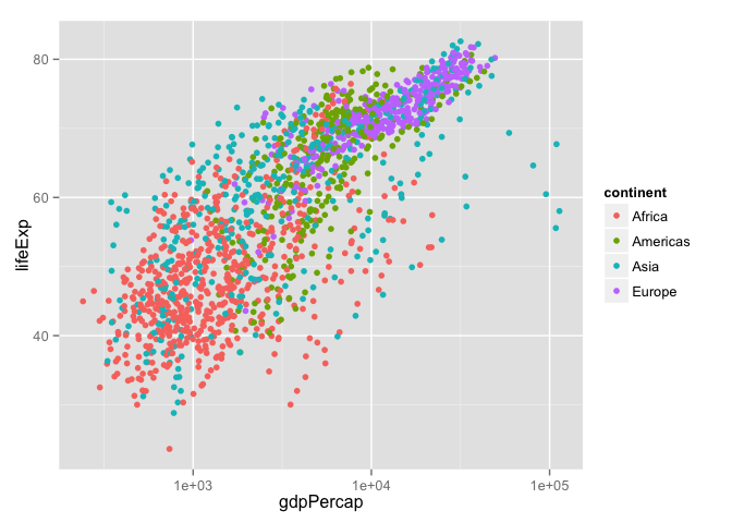 p + geom_point(aes(color = continent)) # map continent to color